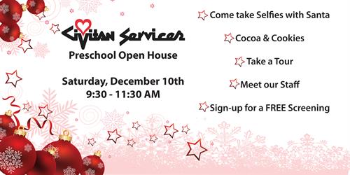 Our Preschool has rennovated the Benton Campus and everyone wants to share the holiday cheer! Come tour our new classrooms and therapy spaces, visit Santa, sample our hot cocoa and cookies and meet our staff. This is a great event for former students and a chance to discuss future enrollment.